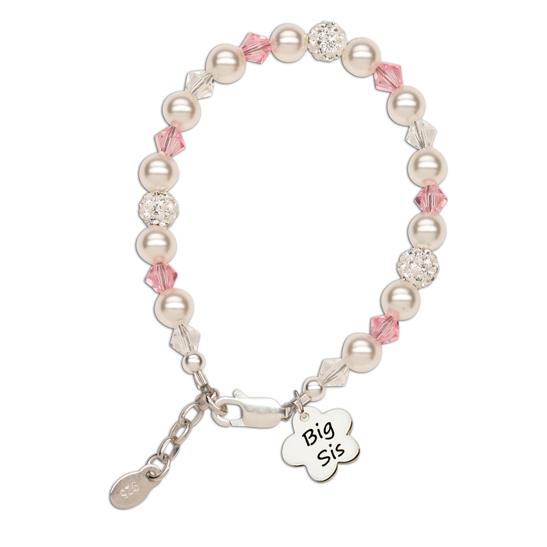 This adorable sterling silver bracelet has soft white high-end simulated pearls and pink crystals accented with sparkling stardust beads and darling "Big Sis" flower charm - perfect gift for sisters!   Bracelet features adjustable sizing you will love.  Just move to the next ring as the child grows for a perfect fit. Bracelet is lead free, nickel free and is safe for your little one to enjoy.
