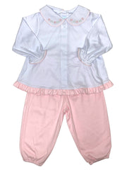 White/Pink 2pc Long Sleeve Shirt W/Floral Emb & Pink Knit Pants