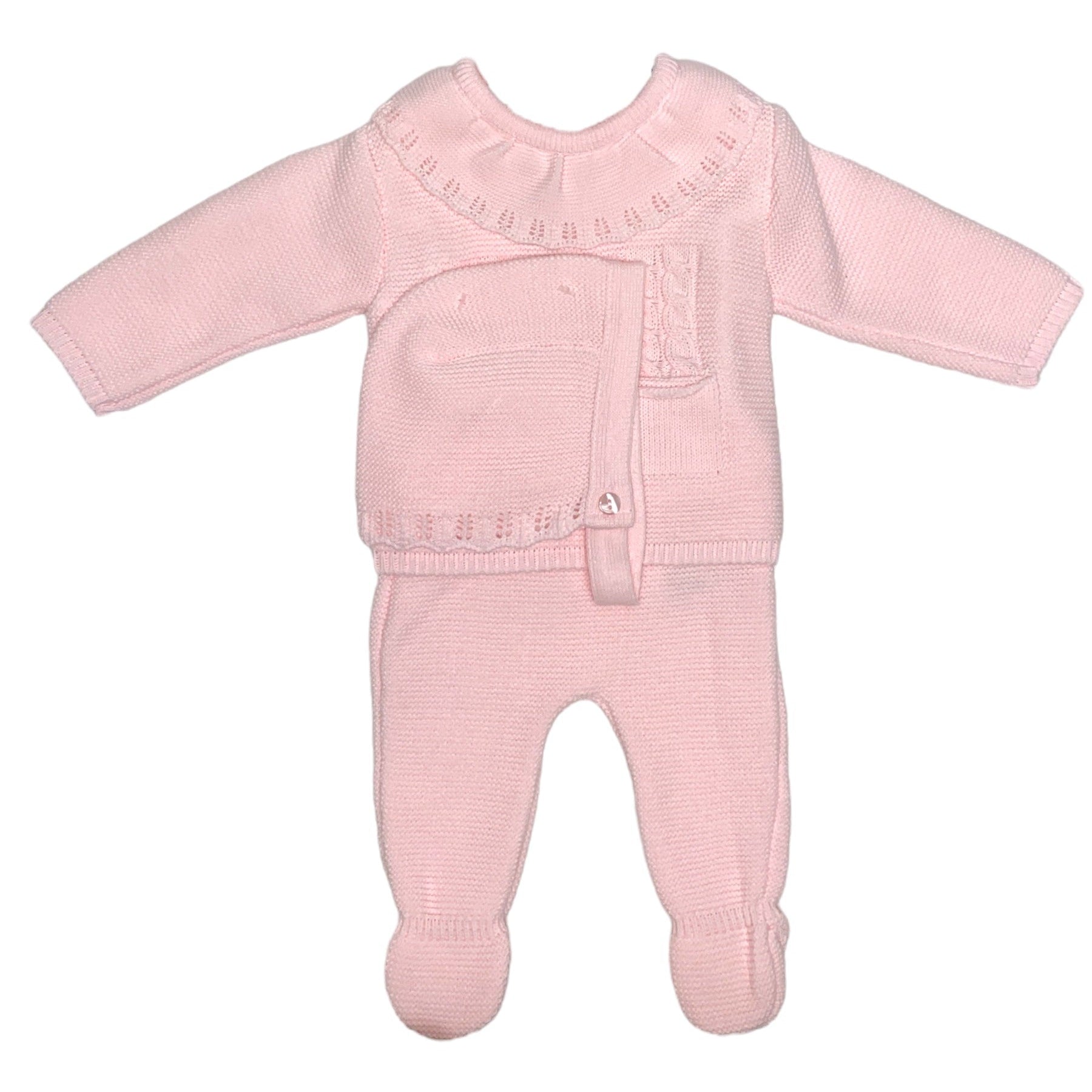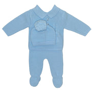 2pcs Knitted Sweater/Footed Pants and Bonnet/Hat. Boys outfit has Hat. Girls outfit has a bonnet.