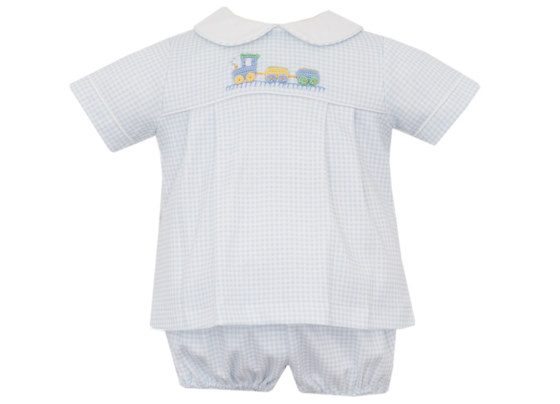 Petit Bebe Train Lt Blue Gingham Knit Boy's Diaper Set S/S 465M-MF25 5208