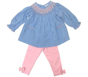 Girls Blue Gingham LS Smocked Tiny Flowers Bishop Legging Set