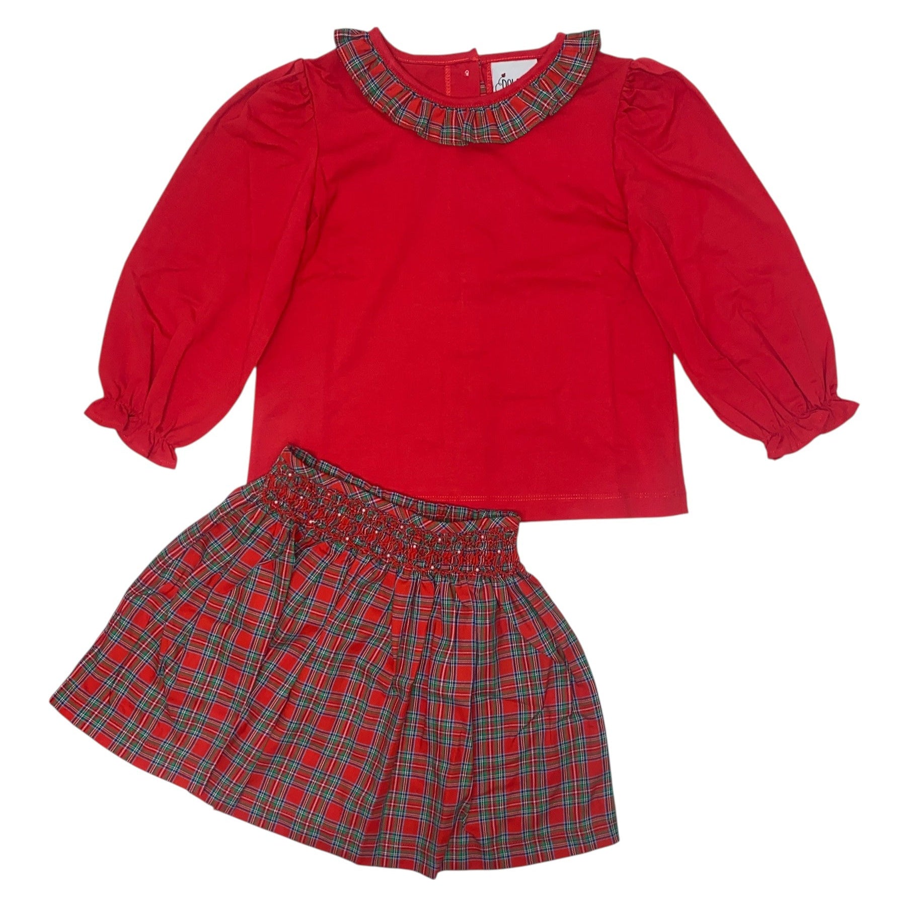 Delaney Girls Red Plaid Smocked Geo-Pearl Skirt/LS Red Knit Ruffle Top DEF25-115 5207