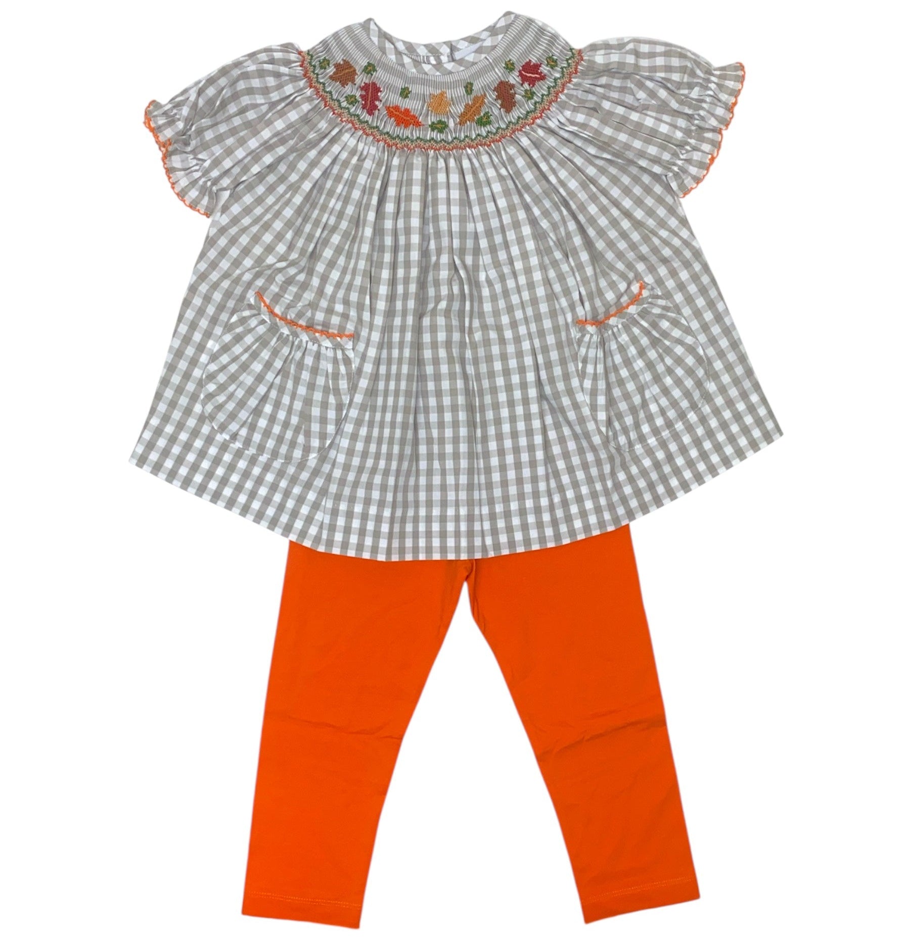 Tan Gingham SS Smocked Fall Leaf Bishop Legging Set