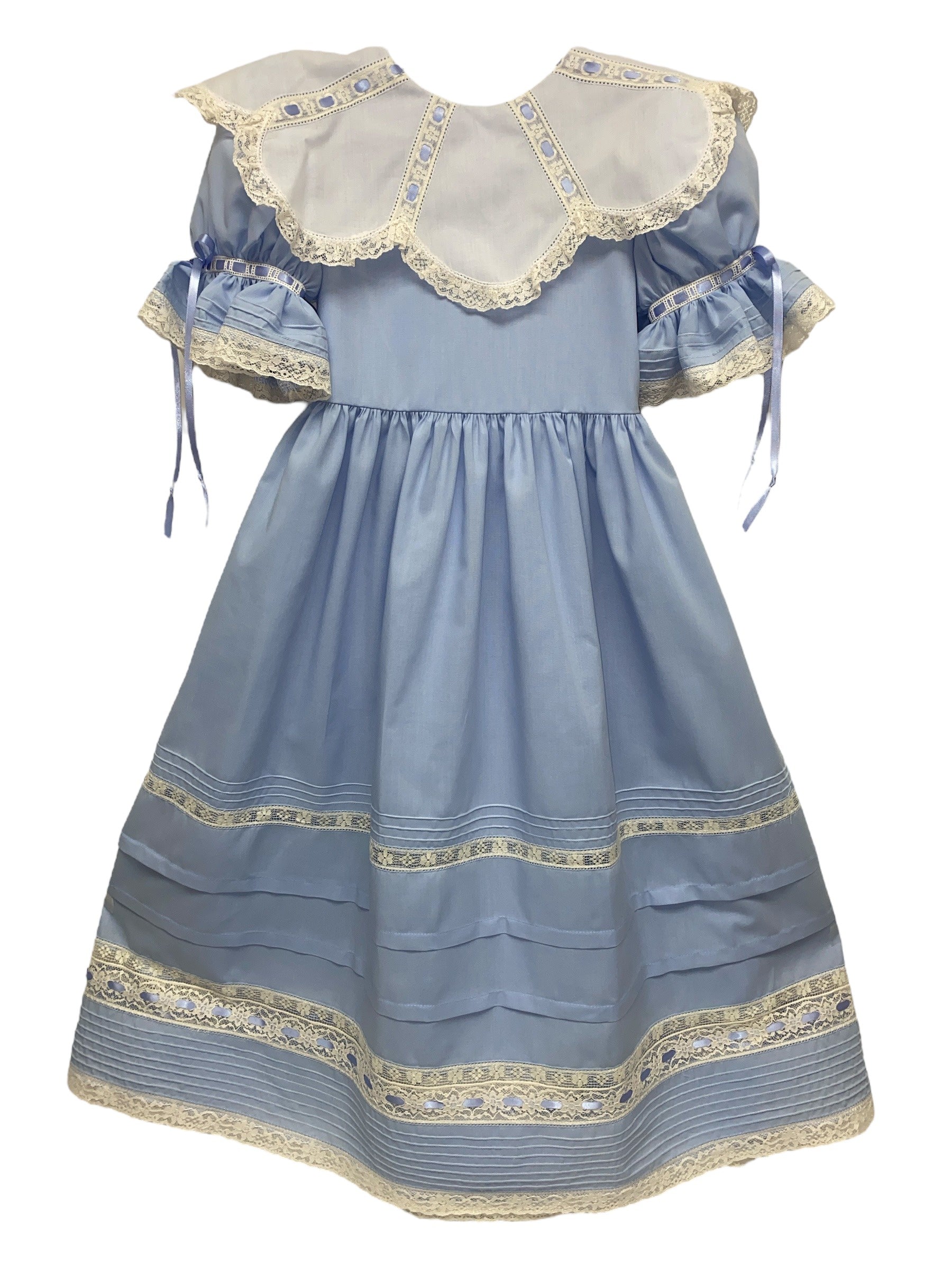 Periwinkle & Ecru Waisted Dress W Collar With Lace Trim & Lace Beading & Ribbon
