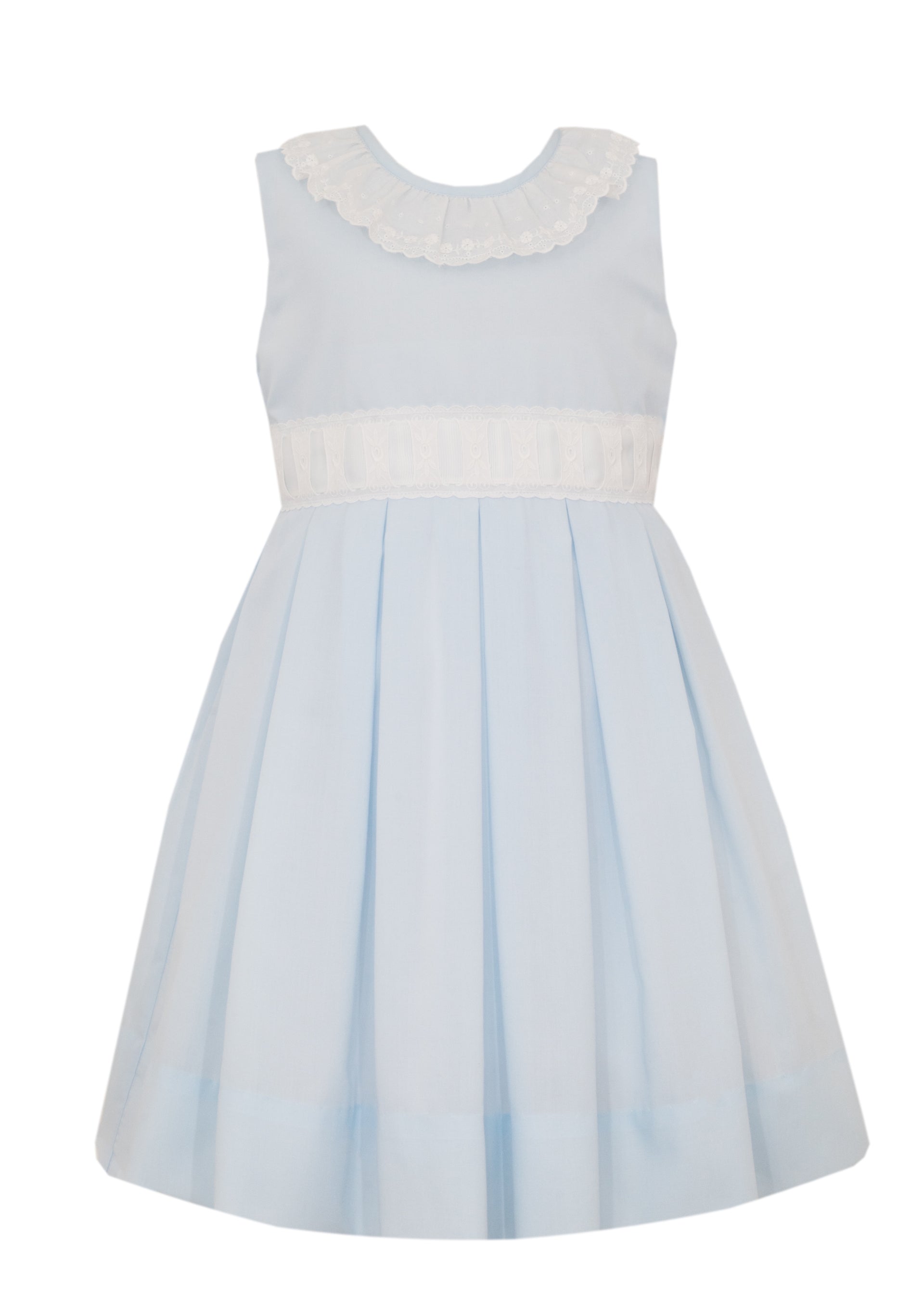 Sleeveless Dress Lt Blue Swiss Batiste W/White Ribbon Swiss Eyelet