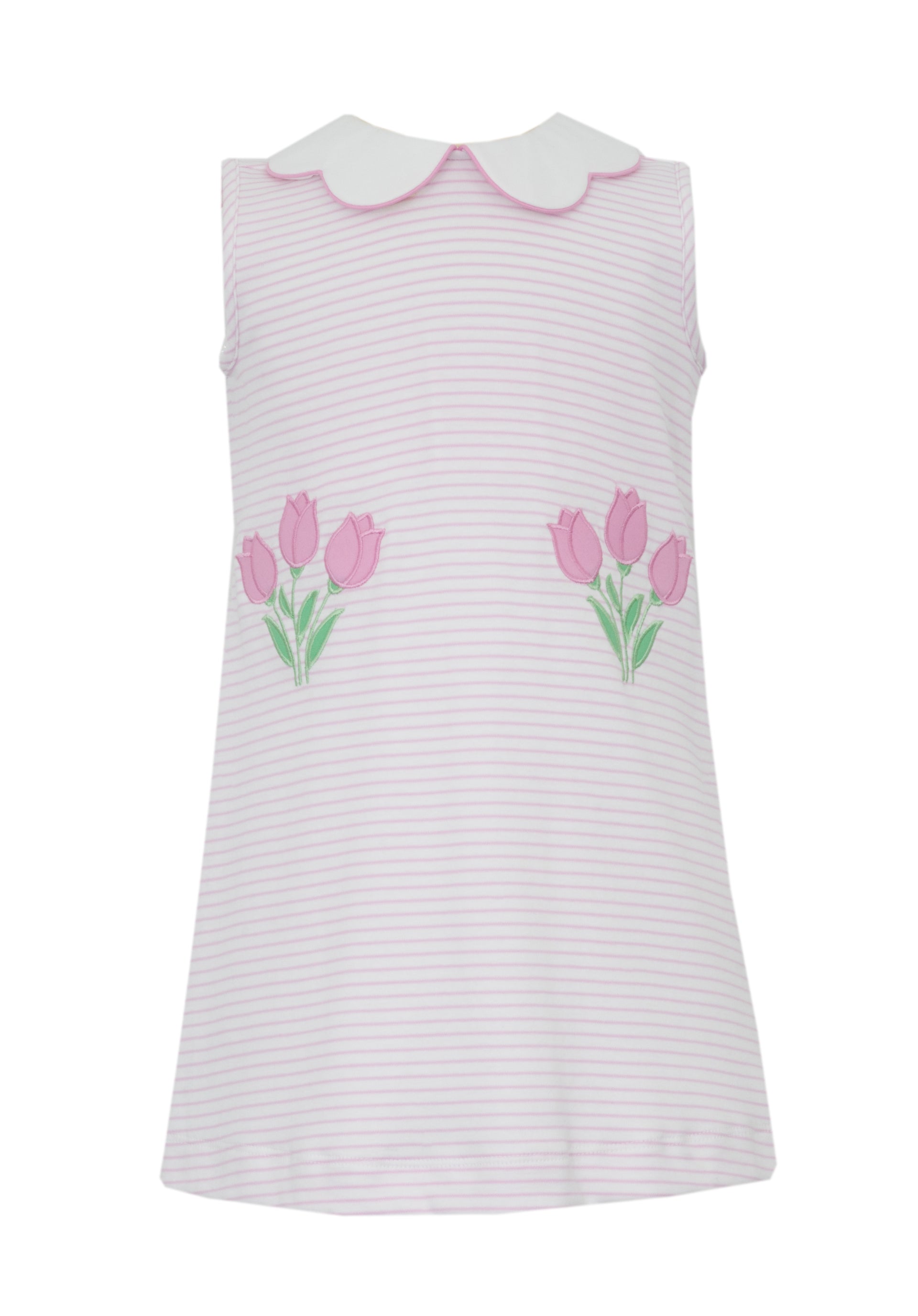 Tulip Bouquet Pink Knit Stripe Sleeveless Dress W/Scalloped Collar