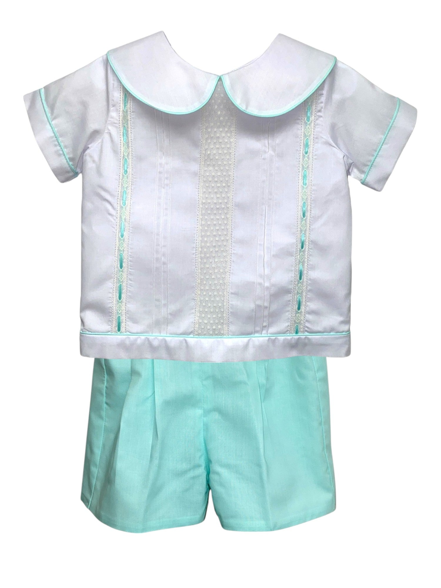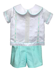 Boys White Shirt W/Seafoam Pinping & Seafoam Shorts.  Ecru Insertion & Seafoam Ribbon