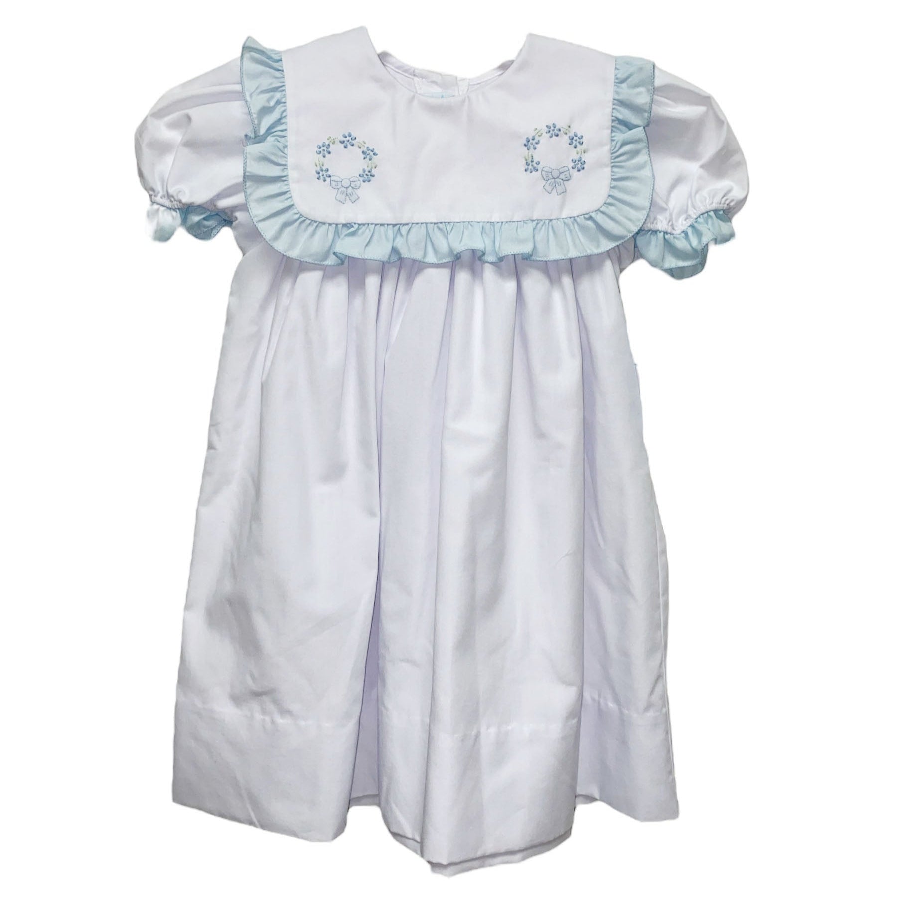 White Dress W/Square Collar W/Ruffle & Scallop Wreath Emb
