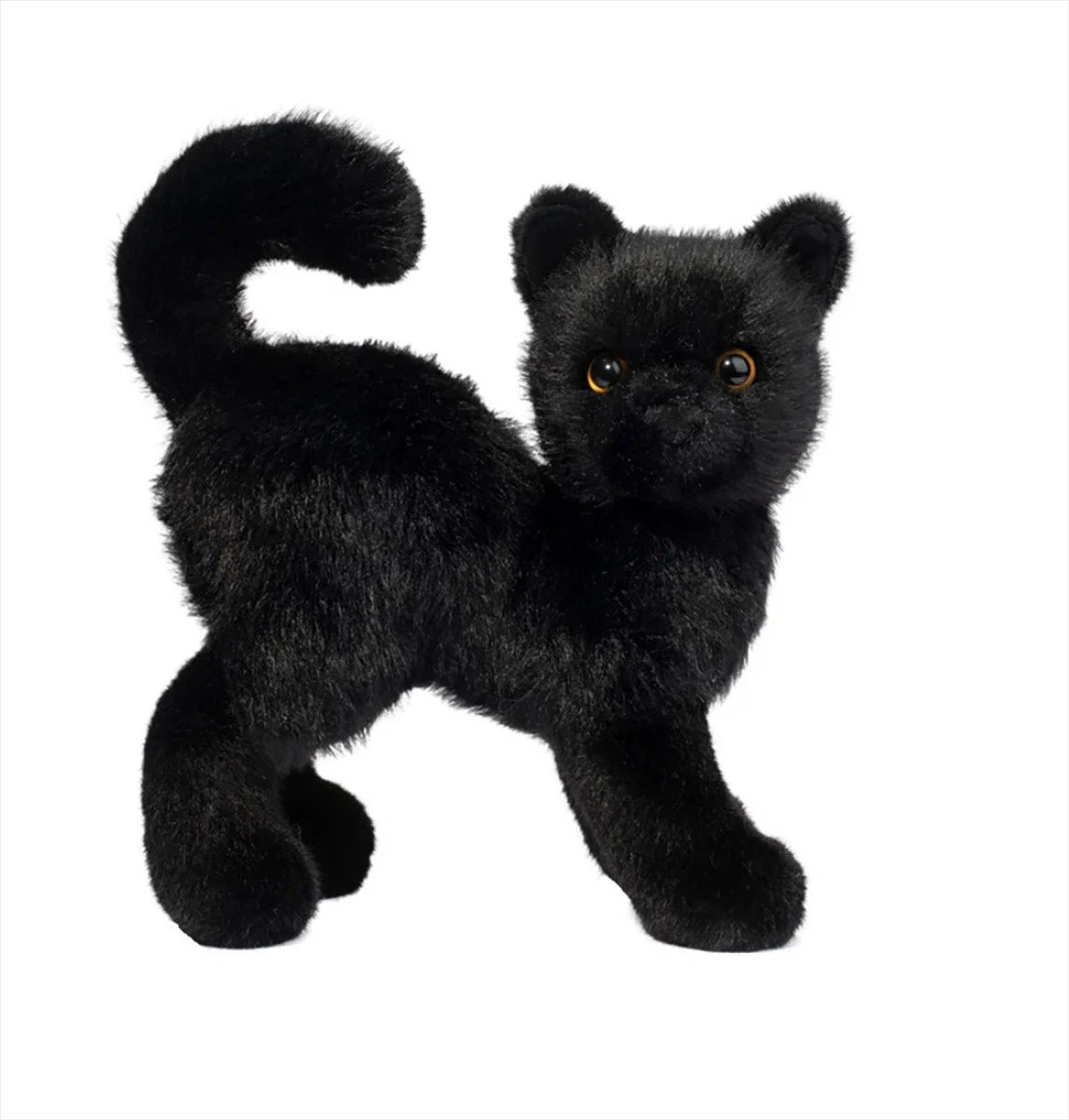 Become spellbound by Scaredy's bewitchingly amber eyes! Scaredy the black kitten is feeling startled. Alarmed. A little scared. All this little one needs a is cuddle to calm down! This snuggly cat featuring soft black fur, a curly tail, and stands at 7" tall. A perfect companion for a witchy Halloween costume! Soft and cuddly plush material Safe for all ages over 24 months, surface washable.